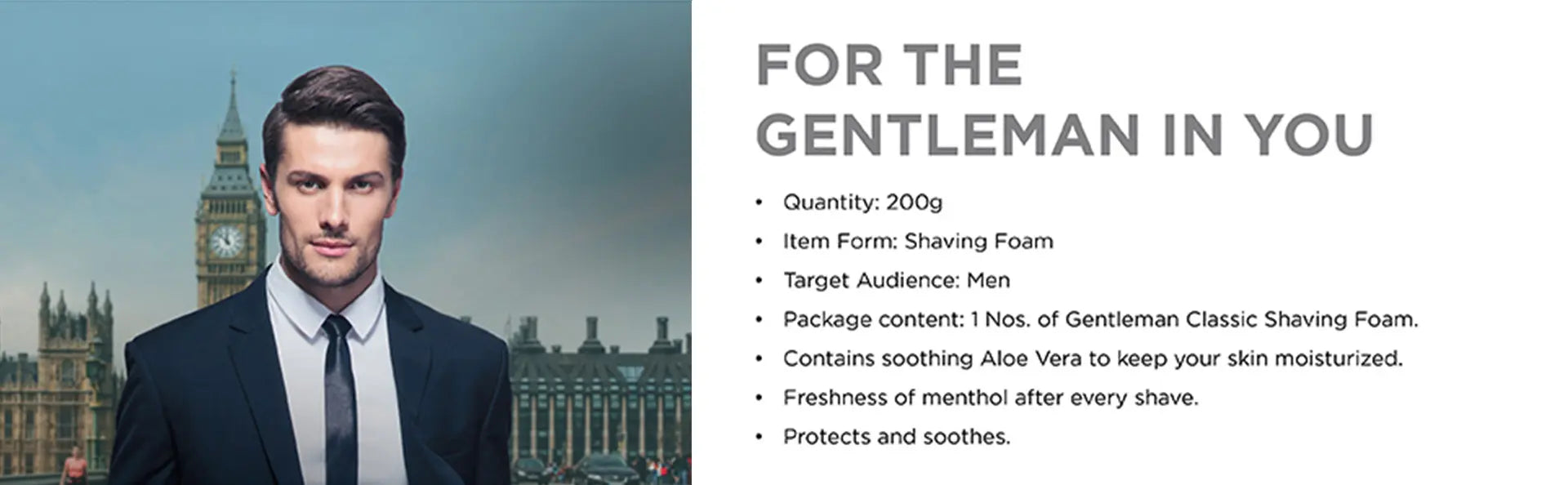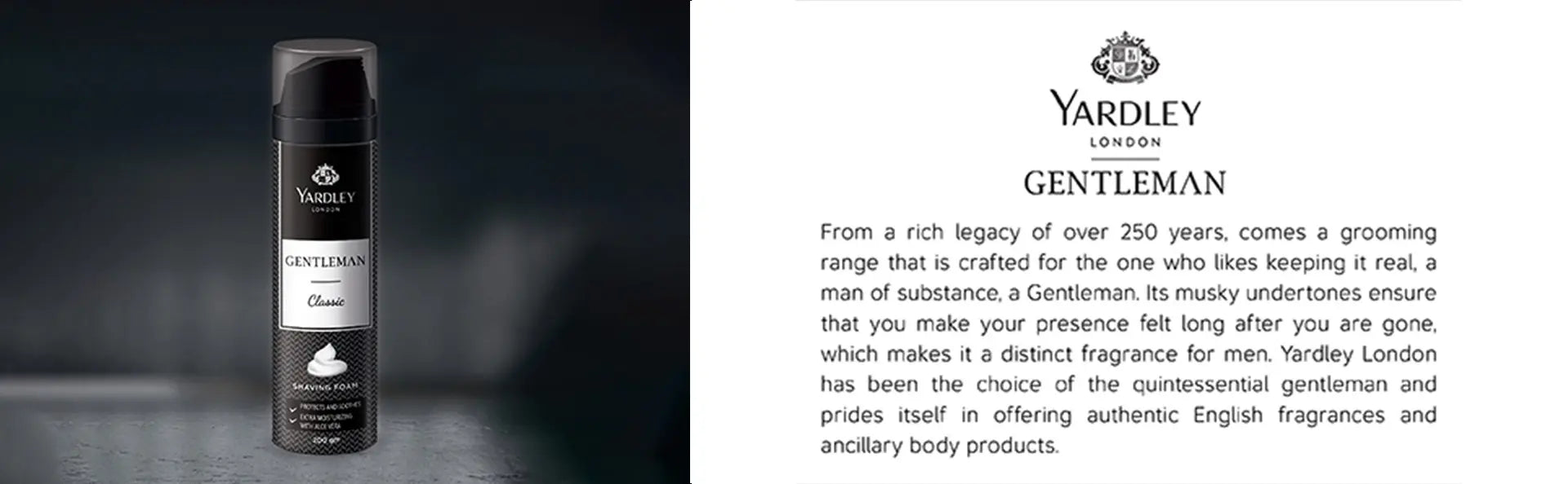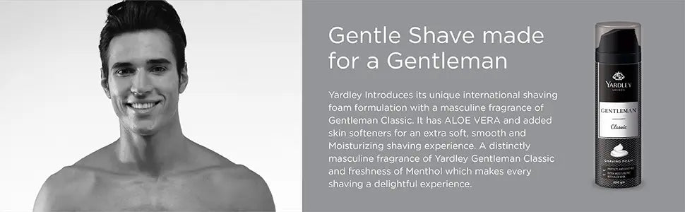 Yardley Introduces its unique international shaving foam formulation with a masculine fragrance of Gentleman Classic. It has ALOE VERA and added skin softeners for an extra soft, smooth and Moisturizing shaving experience. This distinctly refreshing fragrance of Yardley makes the shaving experience truly delightful. Yardley London Gentleman Classic Shaving foam creates a rich lather that acts as an effective cushion between the skin and the blades, making the razor glide across your skin and softening the hairs Contains soothing Aloe Vera to keep your skin moisturized with its powerful antioxidant and anti-inflammatory properties. Enrobing you in a natural, lingering scent of Yardley's signature fragrance of the Gentleman Classic