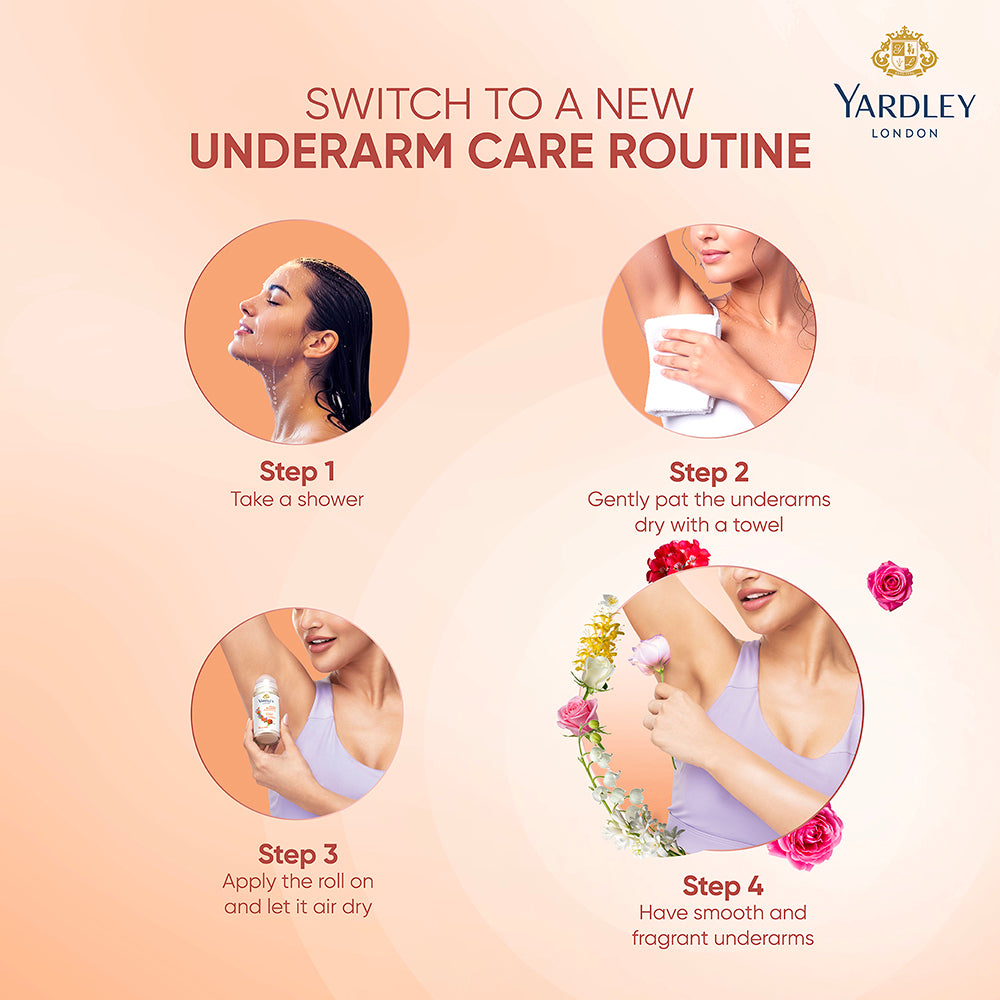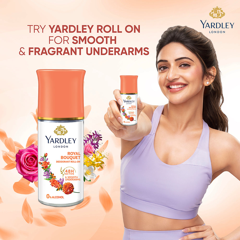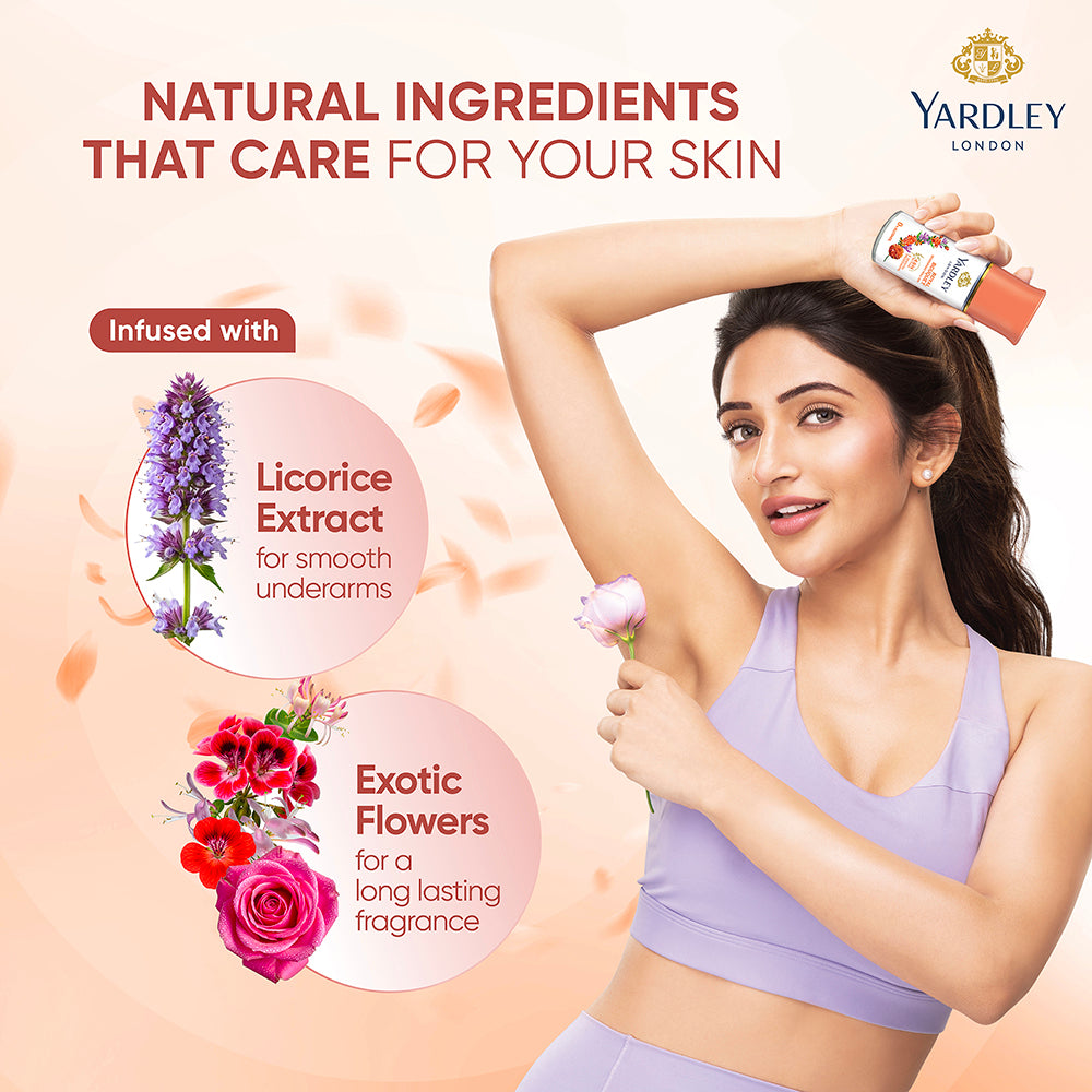Infused with a soft, delicate floral fragrance, the Yardley Royal Bouquet roll-on will elevate your senses with delight. The natural licorice extracts with amino peptide subtly lighten the skin and reduce wrinkles for soft and fairer underarms. Moreover, it offers 48-hour sweat protection.